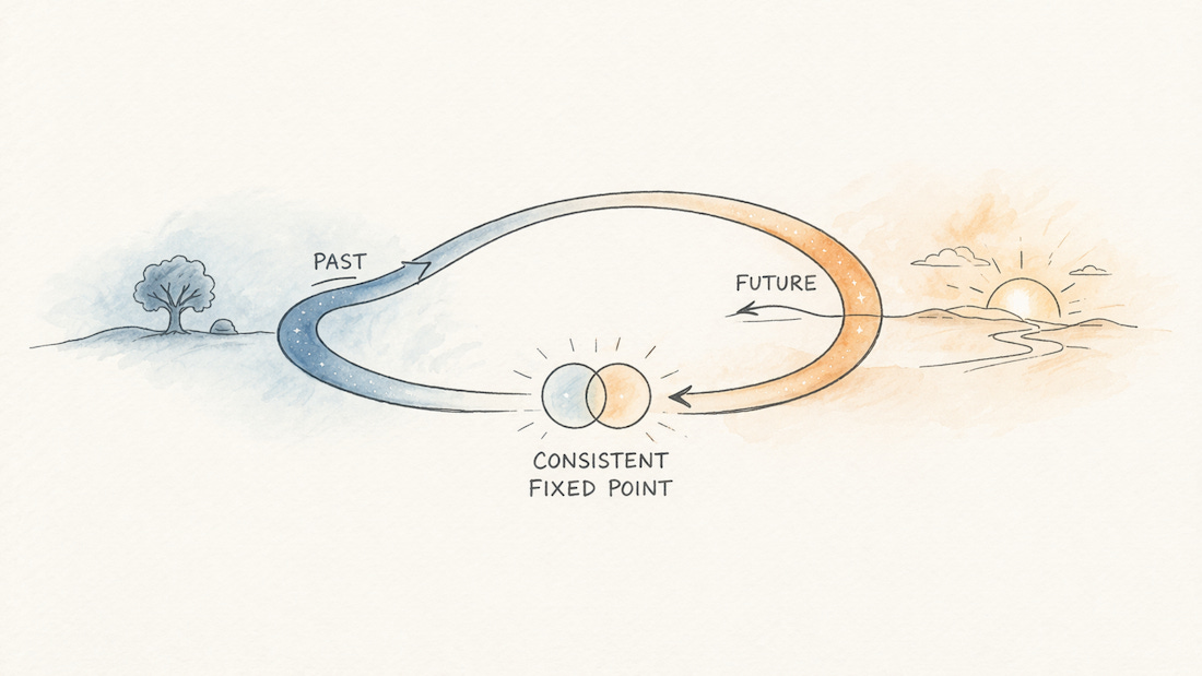 Deutsch’s answer was not that the universe explodes, or that time travel is therefore impossible. His answer was stranger, and much more interesting. The system settles. Past and future exchange information until they arrive at a state that is self-consistent across the loop. If no single state can satisfy both ends, then what remains may be a mixture: several states, each individually consistent, held together at once.